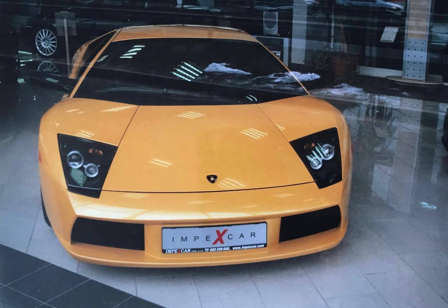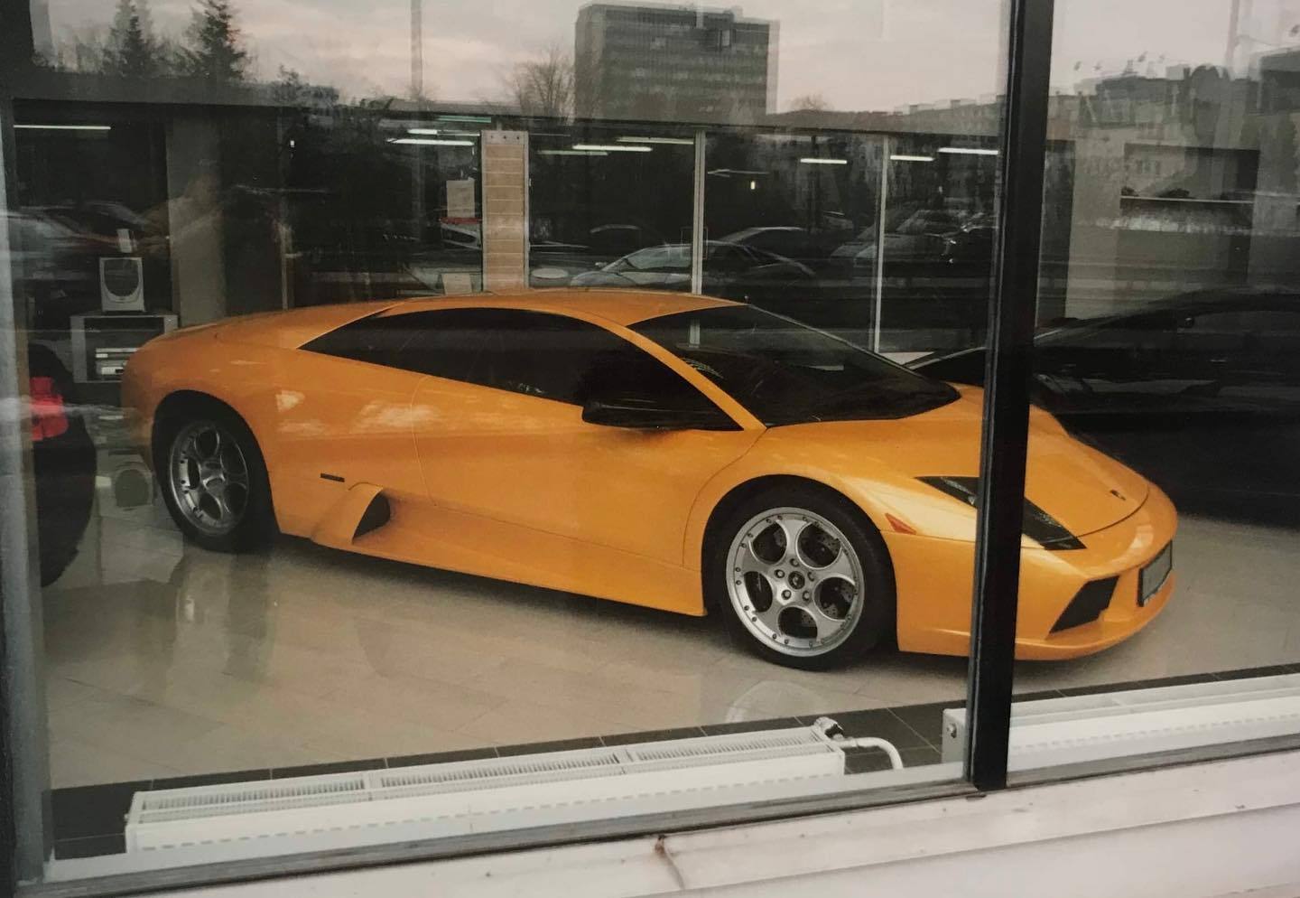 Legendární supersport nultých let LAMBORGHINI MURCIÉLAGO a SUV HUMMER H2 vystavené v salonu IMPEX CAR, sídlící svého času na ulici 5. května, poblíž benziny OMV, ve směru do centra Prahy.