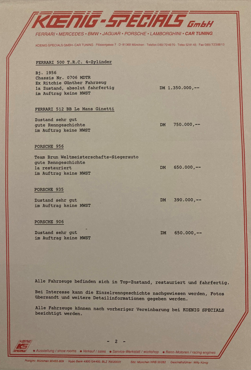 České zastoupení nabízelo i zvláštní, upravený typ PORSCHE 962 LE MANS C62. To se stalo, díky KOENIGu, prvním vozem skupiny C, legálně provozovatelným v běžném silničním provozu. Vůz dokázal jet až 380 km/h.[2]