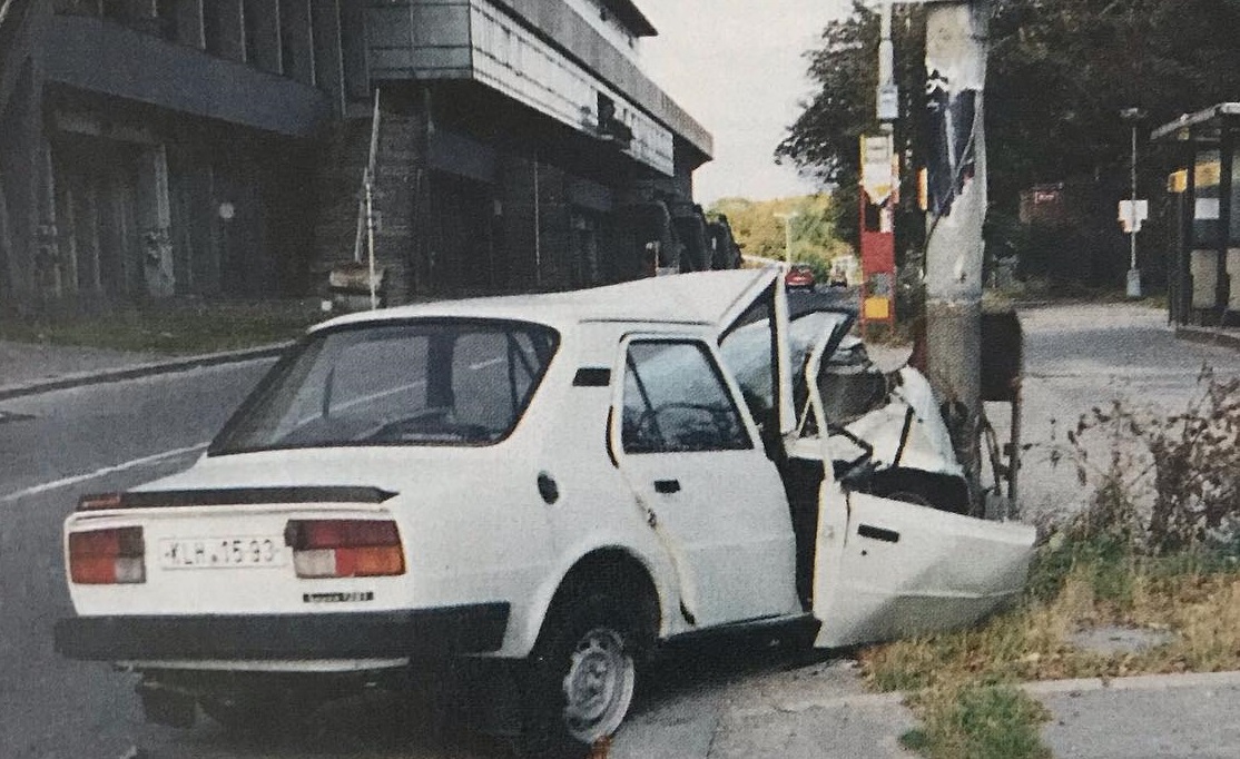Nabouraná ŠKODA 120 v těsné blízkosti Strahovského stadionu v Praze, rok 1994.