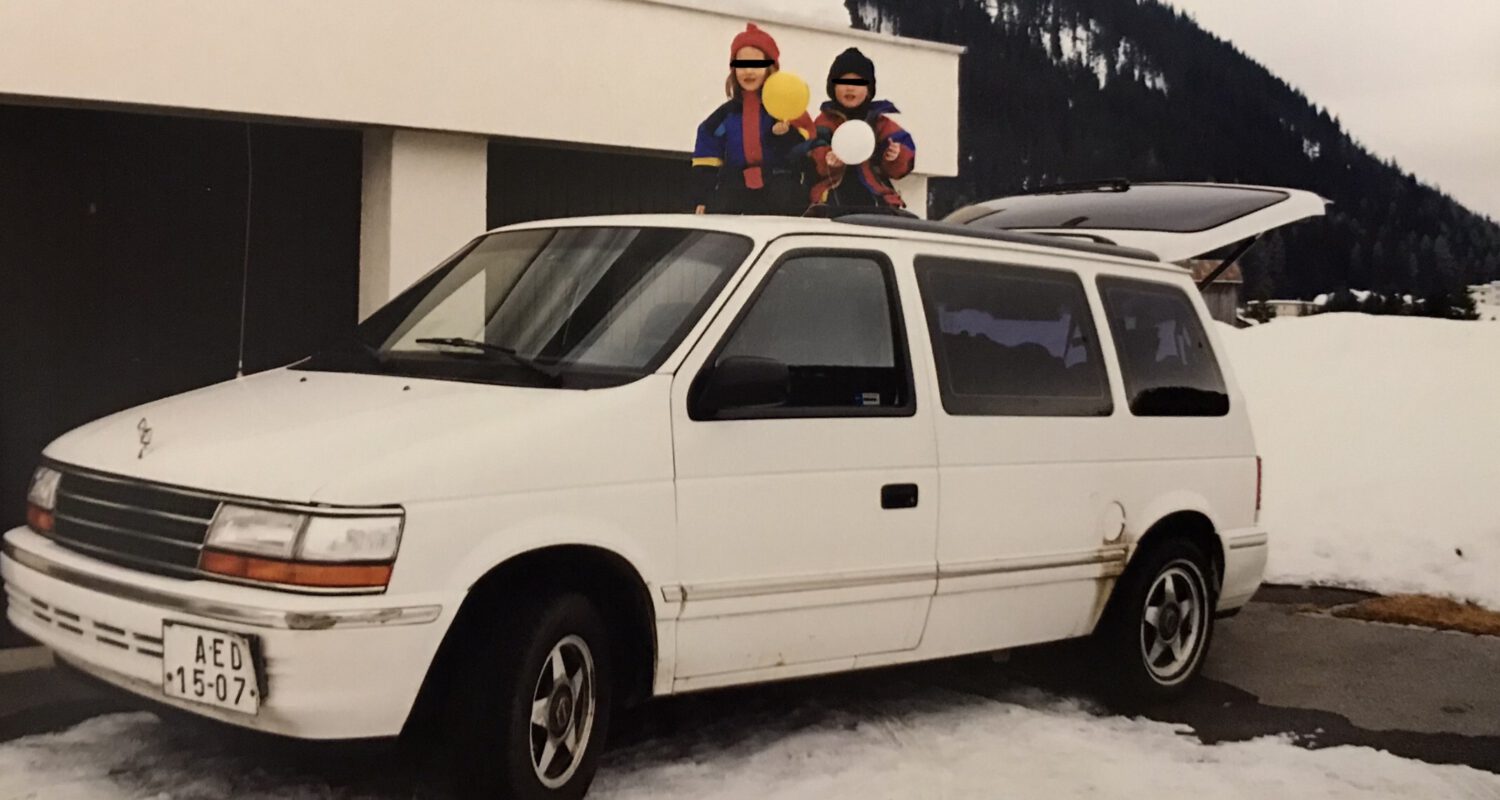 „Toto byl DODGE CARAVAN mého dědy, dovezený z USA. Každoročně jsme s ním jezdili do hor a jednou i k moři až do mých 15 let. Na začátku 0. let s sebou děda vozil dokonce stolní počítač s monitorem, aby mohl dělat business, takže když nás cestovalo sedm (tři dospělí a čtyři děti), bylo to fakt šílený! Lyže jsme dávali na střechu a přivázali kurty. To jsem organizoval já už jako malý! Společná fotografie mě a sestry, kterou zasílám, byla pořízena roku 1999 ve Švýcarsku.“