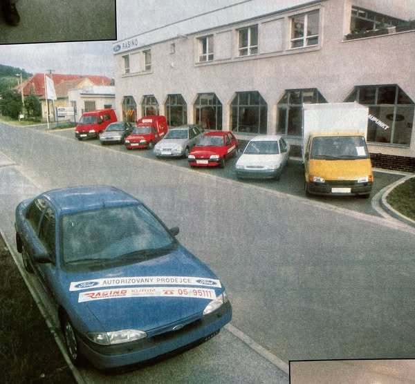 Pohled na autosalon FORD RAŠINO, sídlící v Kuřimi u Brna, rok 1993.