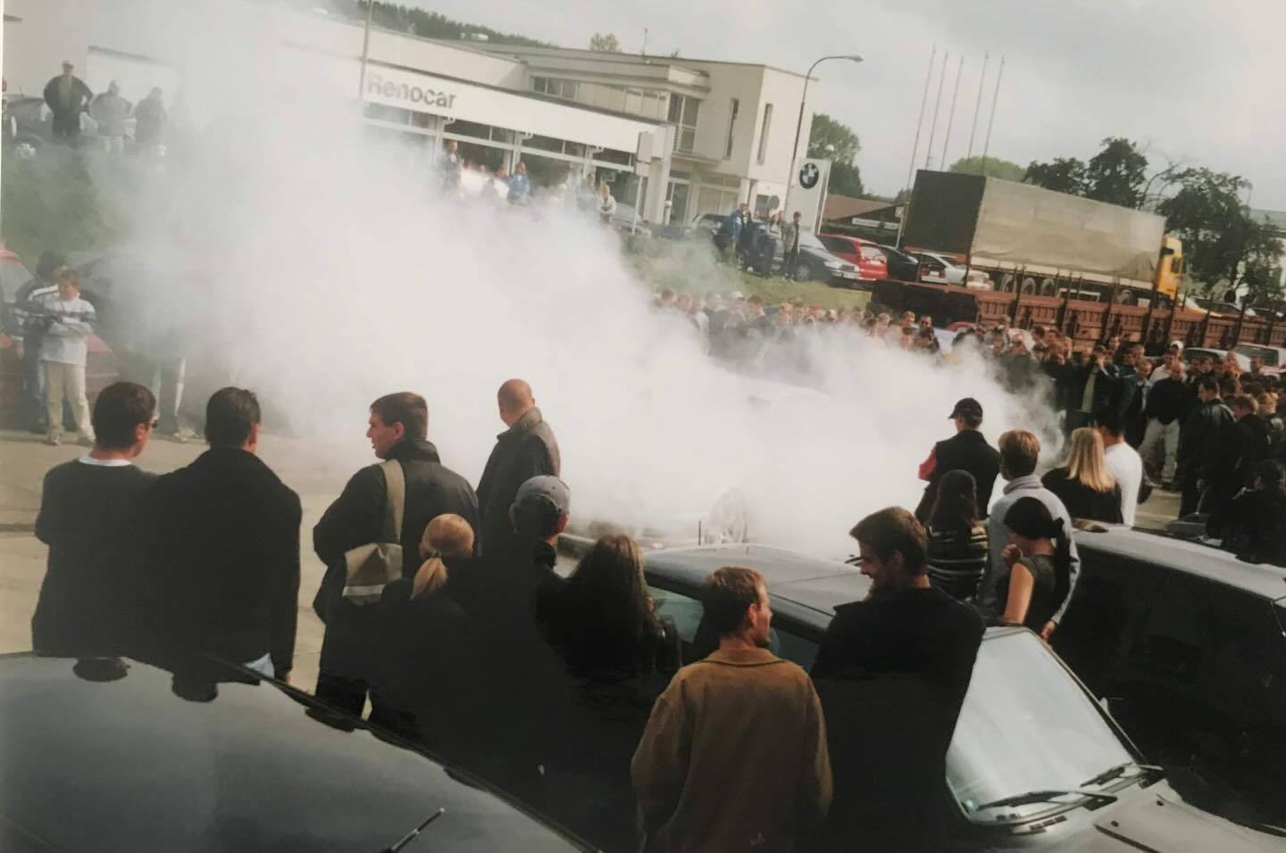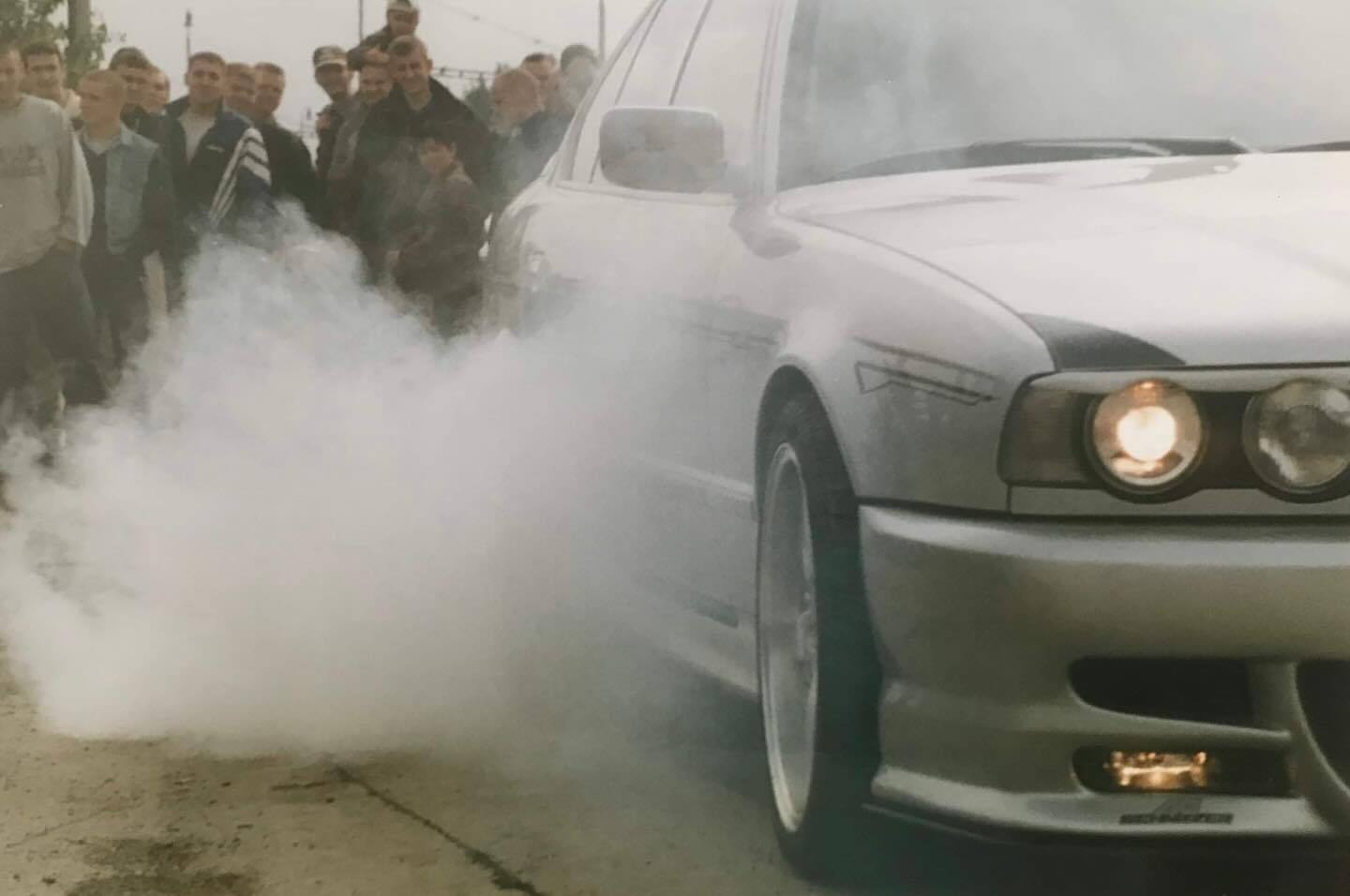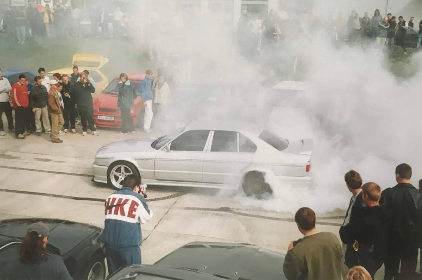 BMW 530 (E34) dělá show-off a pálí gumy na tuning srazu v Brně, rok 2001.