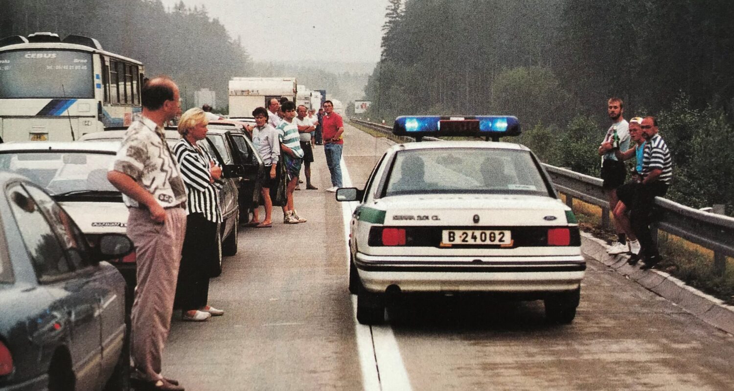 Policejní FORD SIERRA projíždí vedle kolony vozů na dálnici. Dálnice bývaly (a stále jsou) v létě pravidelně ucpané, kvůli opravám. Už v roce 1993 slibovala správa silnic, že do pár let opraví celou D1.