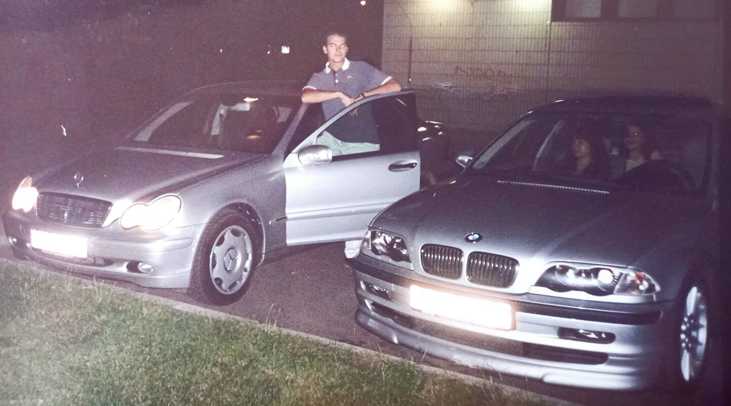 Vedle Mercedesu je zaparkované – dnes již též klasické – BMW 328i (E46) v úpravě Hamann a uvnitř něj dívky, které večerní zábava s novými auty rozhodně baví! ![]()