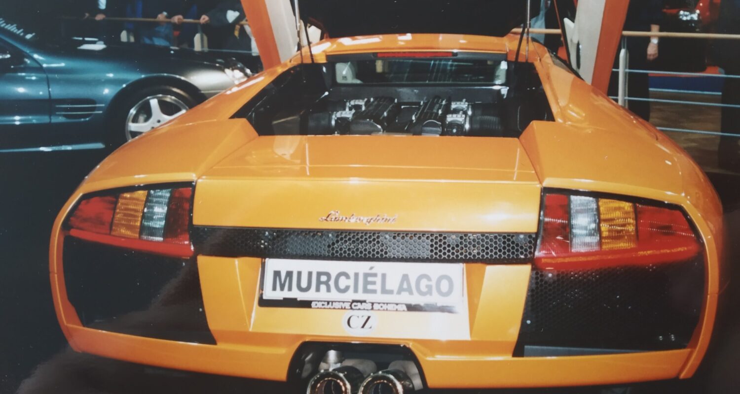 ?LAMBORGHINI MURCIELAGO a ⚪MERCEDES-BENZ SL500 na automobilové výstavě v Praze přibližně na počátku 0. let. Povšimněte si podznačníku pod SPZ Murcielaga. Tento vůz pravděpodobně vystavovala společnost Exclusive Cars Bohemia, která už od roku 1996 dovážela luxusní vozy. Firma taktéž prodávala automobily značek Porsche, BMW, Jaguar, Lamborghini, Mercedes – Benz, Volvo či Land Rover i Rolls Royce a Bentley.