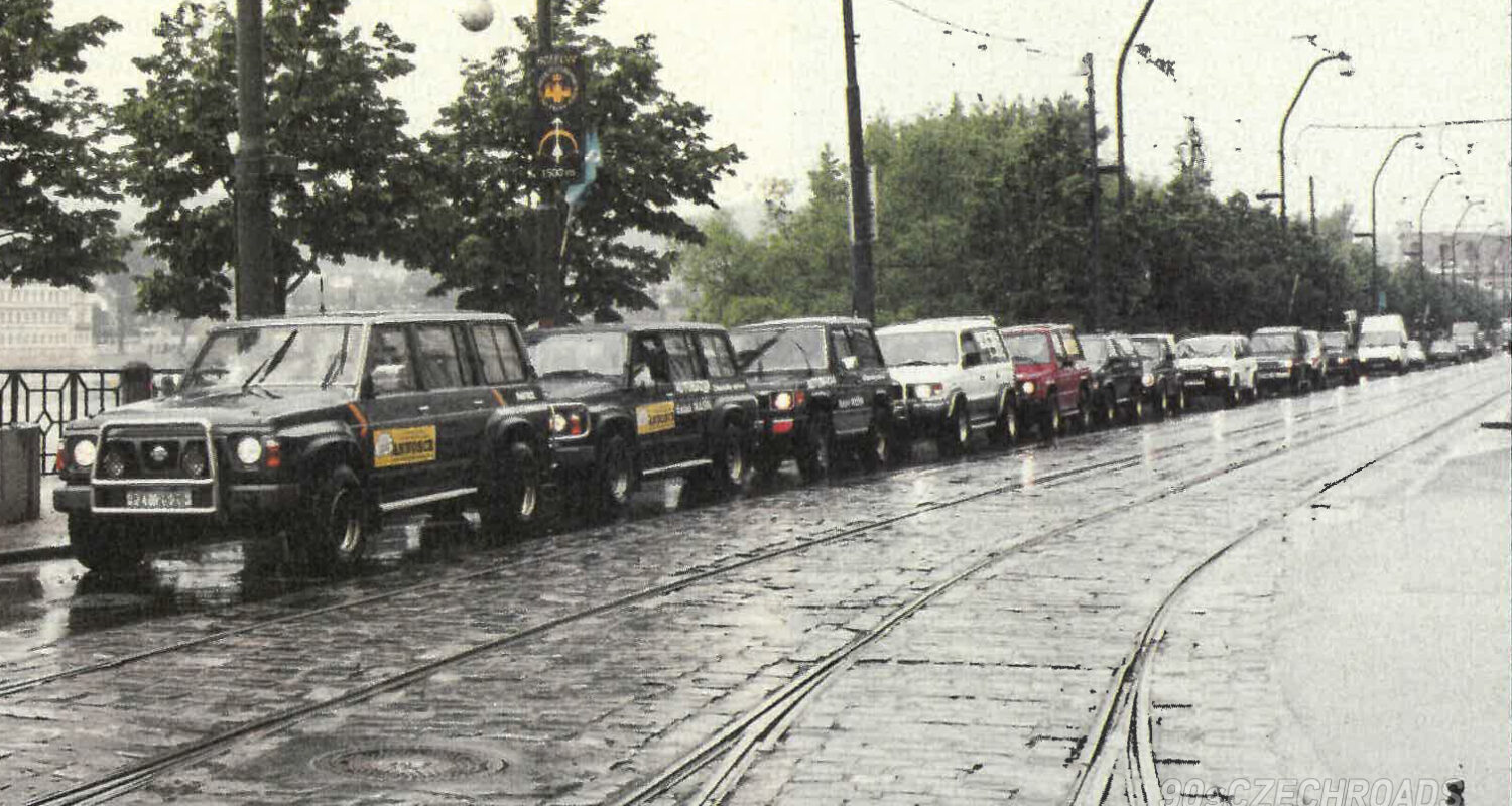 PRAHA 1994. Dlouhá kolona terénních vozů při propagaci autobazaru Mašín zaměřeného na Off Road. Tento autobazar byl otevřen v roce 1994 na Libeňském ostrově v Praze!??