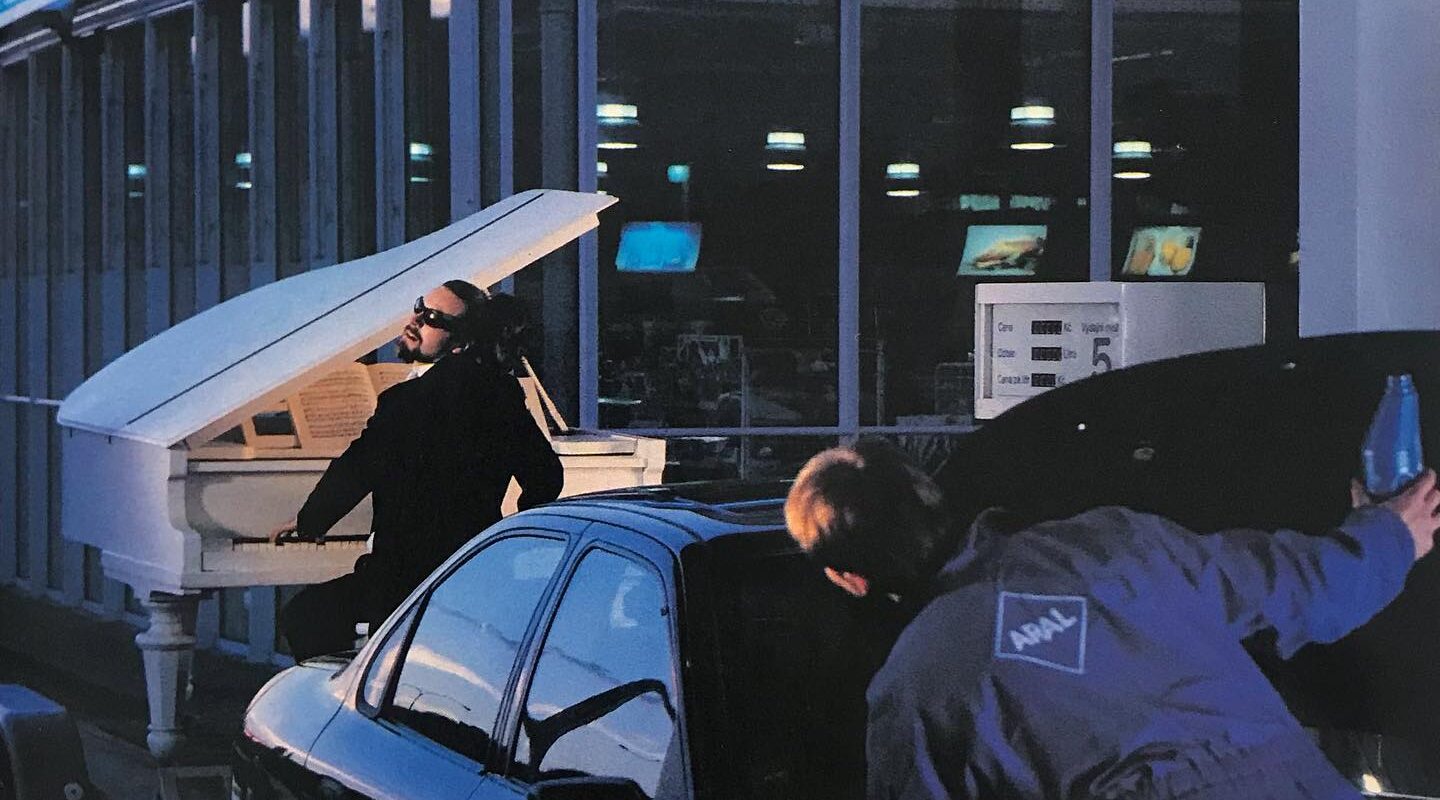 Fotografie vznikla v České republice – povšimněte si popisů v českém jazyce na čerpacím stojanu. Vůz, který táhne krásné bílé piáno i s pianistou je legendární evropský sedan, nezapomenutelný FORD MONDEO!